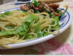 オリーブオイル炒めはウインナー、にんじん、ピーマン、ナス。仕上げにバジルとガーリック味を振りかけてできあがり